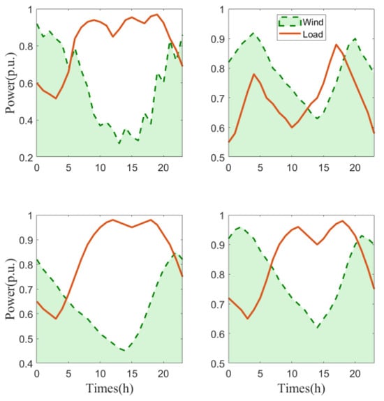 RESs and loads have different power curves in different seasons. In order to explore the inertia distribution characteristics of a power system during different time periods, this study considers four normalized power scenarios of wind and load, as shown in Figure 8, aiming to configure the GFM-ESS and GFL-ESS in the most economical way. This will help improve the utilization efficiency of RESs in the power system and enhance the inertia distribution characteristics of the power system.