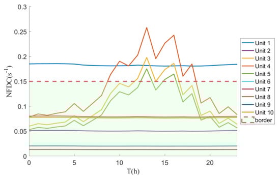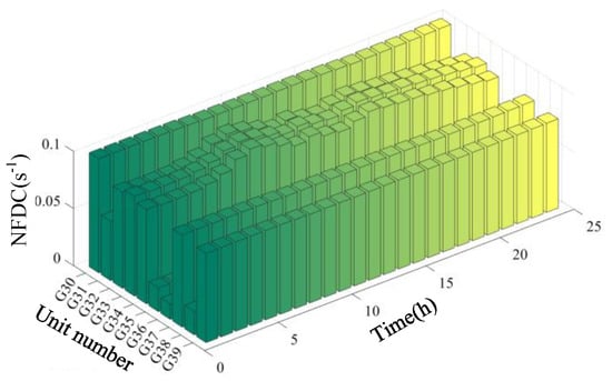 The value of the NFDC can represent the strength of the inertia support capability of each node in the power system. The variation in the NFDC of each generator in scenario 1 is shown in Figure 9.