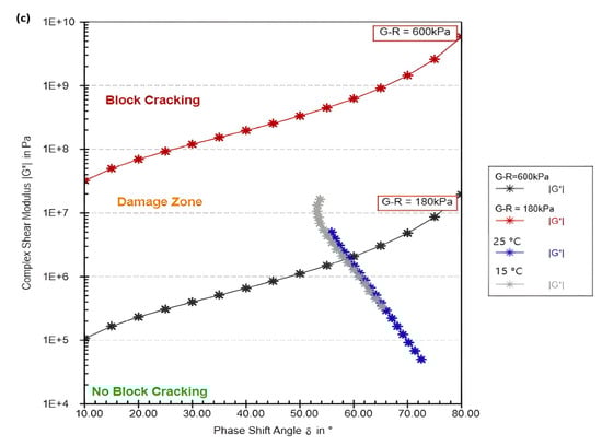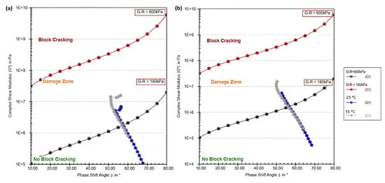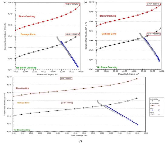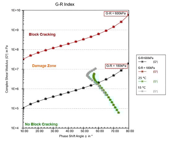 The 15 °C results represent cooler climatic conditions, where binders with higher G–R values are more likely to experience thermal and fatigue cracking. In contrast, the 25 °C results simulate warmer environments where rutting is more critical; binders with low G–R values in this range may be more vulnerable to permanent deformation. This plot offered valuable insights into the bitumen’s ability to resist cracking and rutting, particularly under different climatic and loading conditions. The G–R index also helped to determine the material’s performance limits, highlighting when it transitions from an undamaged state to a damage-prone zone.