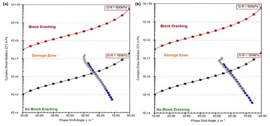 In the 4% SBS sample (Figure 2a), the bitumen shows improved flexibility compared to unmodified bitumen, as indicated by its position in the no block cracking region at both 15 °C and 25 °C under lower stress (G–R = 180 kPa). At 25 °C, the bitumen maintains its flexibility, staying in the no block cracking zone for most of the phase shift range. However, under higher stress conditions (G–R = 600 kPa), the material begins to approach the damage zone, reflecting some reduction in elasticity but still showing resilience compared to unmodified bitumen. The increased SBS content enhances the bitumen’s ability to deform without cracking, but at low temperatures, particularly at 15 °C, the material moves closer to the block cracking region, indicating increased stiffness under these conditions. Overall, the 4% SBS-modified bitumen offers significant improvement in flexibility, especially at higher temperatures, though some vulnerability to cracking remains at low temperatures and high stress.