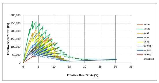 Moreover, the linear amplitude sweep (LAS) test has gained significant attention in recent research as an effective tool for evaluating the fatigue characteristics of modified asphalt binders. According to Zhou et al. [20], the conventional parameter G*sinδ alone may lack sensitivity in distinguishing the fatigue resistance of various binders, highlighting LAS testing as a superior alternative for such assessments. This testing approach proves especially valuable when examining the performance of binders modified with materials like styrene–butadiene–styrene (SBS), bone ash, and cooking oil, as it provides a more nuanced insight into their performance across diverse stress conditions.