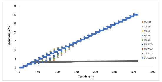 In conclusion, this study identifies 5% SBS as the most effective modifier for enhancing bitumen’s rheological performance under various loading conditions, while 6% animal bone ash provides the greatest improvement in stiffness, and 4% waste cooking oil offers a balanced enhancement in flexibility. These findings offer valuable insights into the development of high-performance, eco-friendly pavement materials.