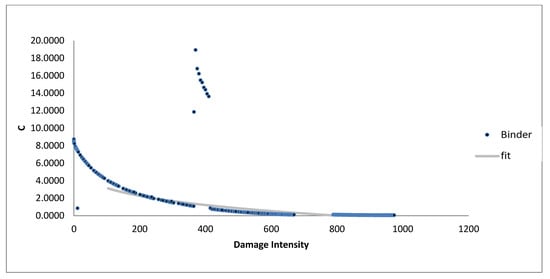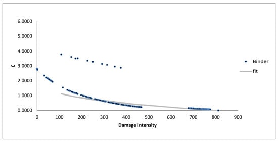 Figure 8 and Figure 9 illustrate the performance of bitumen samples modified with 4% and 5% styrene–butadiene–styrene (SBS), showing noticeably less steep damage curves. Notably, the 5% SBS sample in Figure 9 demonstrates a gradual slope, indicating slower damage accumulation than the unmodified sample. This improved resistance to cumulative damage is likely due to SBS’s ability to form a resilient polymer network within the bitumen, enhancing its capacity to absorb and dissipate strain energy effectively. The polymeric structure of SBS contributes both elasticity and toughness, making it suitable for applications where durability under repetitive loading is critical. Consequently, SBS-modified samples resist micro-damage formation more effectively, extending the material’s lifespan in high-stress environments.
