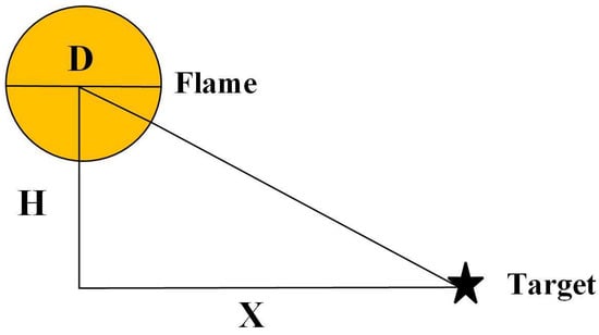 The target is at a certain orientation on the ground and the vertical distance from the center of the flame is X m. D is the flame diameter and H is the height of the flame center. The geometric view factor at different distances from the target are: