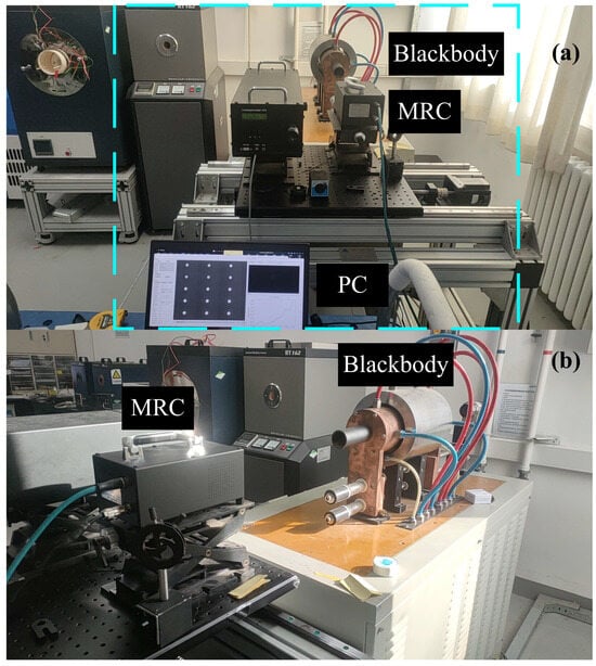 Schematic diagram of high temperature blackbody furnace calibration experiment. (a) Temperature calibration overall picture; (b) multispectral radiance camera (MRC) and high temperature blackbody furnace site plan.