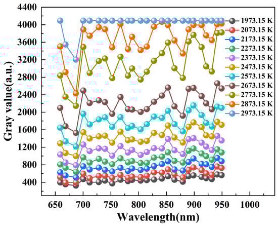 The average gray value of the effective radiation region of the blackbody furnace was selected as the response value of different bands. The sampling bit depth of the multispectral camera was 12 bit, and the range of the gray value is 0–4096, which ensured that the multispectral camera had a wide temperature range after high-temperature calibration. The average gray values of the 25 bands at temperatures from 1973.15–2973.15 K are shown in Figure 4.