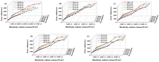 Based on the calibration results, the relationship between the grayscale response values of each spectral channel and the corresponding spectral radiance under high-temperature conditions was established. The functional relationship can be expressed as: