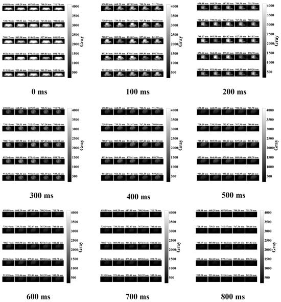 In this study, for safety reasons, the experiment was conducted in an open clearing in the forest, causing no damage to the surrounding trees. A simulated deflagration flame experiment with a solid fuel was conducted, and the multispectral image of the simulated flame was acquired using a multispectral camera at a frame rate of 200 Hz, as shown in Figure 6. The brightness of the flame at 0 ms was the largest, the brightness of the flame at 100 ms decreased a little, and the brightness of the multispectral image at 200 ms did not change much. There was also a small area of rekindling phenomenon with the presence of bright light. The flame brightness gradually decreased from 300 ms.