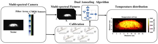 The multispectral camera captured a multispectral image of the simulated deflagration flame. The system integrated the blackbody furnace calibration function with a dual annealing multi-objective constraint optimization algorithm to optimize the emissivity of each channel, ensuring that the constraint function approached zero. This process guaranteed that the temperature calculated for each channel closely aligned with the average temperature across all channels, effectively mitigating the influence of emissivity. The method enabled the determination of the two-dimensional real temperature distribution of the exploding fireball. A flowchart illustrating the multispectral temperature solving process is presented in Figure 7.