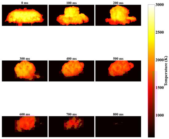 The complete 25-band multispectral image of the deflagration flame was iteratively optimized using the double annealing multi-objective constrained optimization algorithm. In this way, the two-dimensional temperature distribution of the deflagration flame with the effect of the emissivity eliminated was finally obtained, as shown in Figure 9.