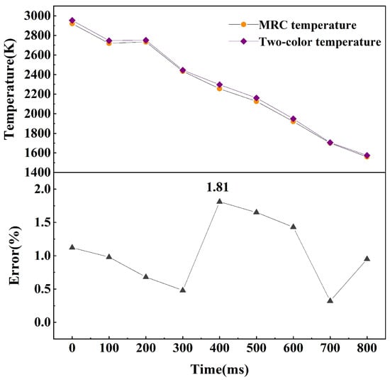 The temperature of the simulated deflagration flame was also collected with the calibrated CIT-3MD2-T0830&T0409-W34-HS2us two-color pyrometer and multispectral camera; a maximum temperature profile comparison graph is shown in Figure 10. The maximum temperature of the deflagration flame measured by the colorimetric pyrometer TC was 2953.07 K, and the maximum temperature measured by the multispectral camera was 2920 K, with a relative measurement error of 1.12%. The overall temperature trend of the two methods was consistent, with a maximum relative measurement error of 1.81%.