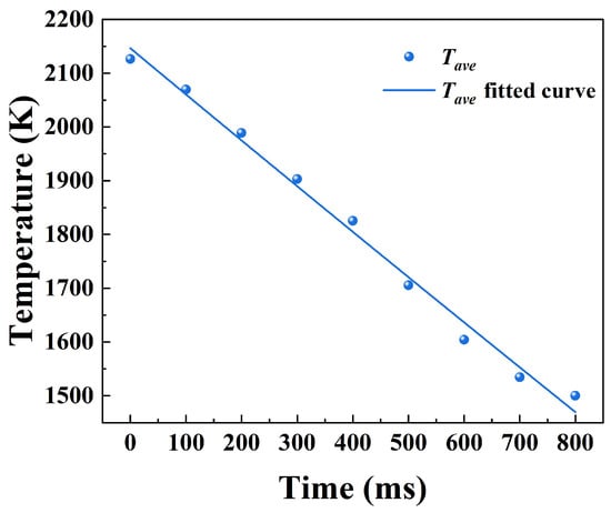 The equivalent average temperature Tave of the equivalent thermal radiation intensity on the surface of the simulated deflagration flame was between 1500 K and 2200 K. The overall temperature trend function is presented in the form of a 2nd-order fit function, with a good fit optimality of 0.991, as shown in Figure 11.