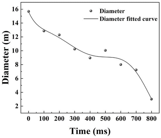 Figure 12 illustrates the simulation of the deflagration flame. At 0 ms, the fireball diameter reached a maximum value of 15.68 m. Between 300 ms and 500 ms, the fireball diameter initially decreased before increasing again, with a diameter of 10.05 m recorded at 500 ms. Following this, the fireball diameter gradually decreased to 3.01 m. Overall, the trend of the simulated deflagration flame diameter was complex and is represented here by a multi-order fitting function.
