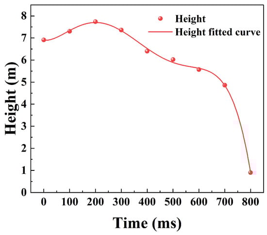 Through Figure 13, it can be found that the simulated deflagration flame height changes showed a trend of increasing and then decreasing; the height of the explosion fireball reached a maximum value of 7.74 m at 200 ms, and then the fireball height gradually decreased to 0.9 m. The overall height change of the simulated deflagration flame is presented in the form of a multistage fitting function.