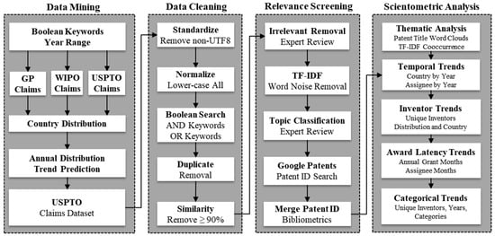 After isolating patents containing the keywords, the workflow extracted country and annual distributions to guide trend prediction and identify the most promising dataset. The subsections that follow further describe the data extraction, data cleaning, thematic analysis, and scientometric analysis portions of the workflow.
