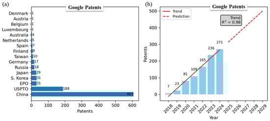 Google Patents results by (a) patent office country and (b) year with regression forecast.