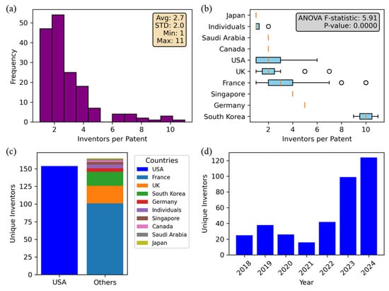 Figure 8 analyzes the effort thrust in hydrogen aviation innovations based on various statistics of inventor participation. Figure 8a shows that most patents had two to three inventors, with an average of 2.7. Figure 8b reveals statistically significant differences in team size by country (ANOVA p < 0.0001), with South Korea exhibiting larger teams. Figure 8c shows the U.S. leads in unique inventors for USPTO-issued patents, followed by France, the UK, and South Korea. Figure 8d highlights a surge in new inventors from 2022 to 2024, indicating expanding participation in the field. These results reflect increasing global interest and competition in hydrogen aviation innovation.