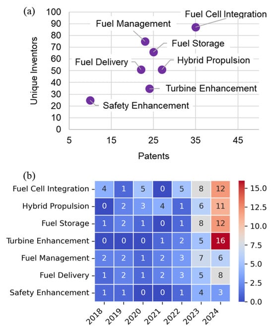 Figure 9b tracks category growth over time. Turbine enhancement saw a major spike in 2024, while fuel cell integration, hybrid propulsion, and fuel storage have shown consistent upward trends. These results highlight both maturing and emerging focus areas within the field.