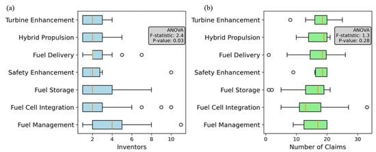 Figure 10 compares inventor team size and claim count across the invention categories. Figure 10a shows a statistically significant difference in inventors per patent (p = 0.03), with fuel management and fuel storage often involving larger teams. This could suggest higher technical complexity or collaboration in those categories. Figure 10b shows no significant difference in claim count (p = 0.28), indicating that patents across categories are similarly detailed or complex. Together, these insights suggest some categories are more collaborative, while innovation scope remains broadly consistent.