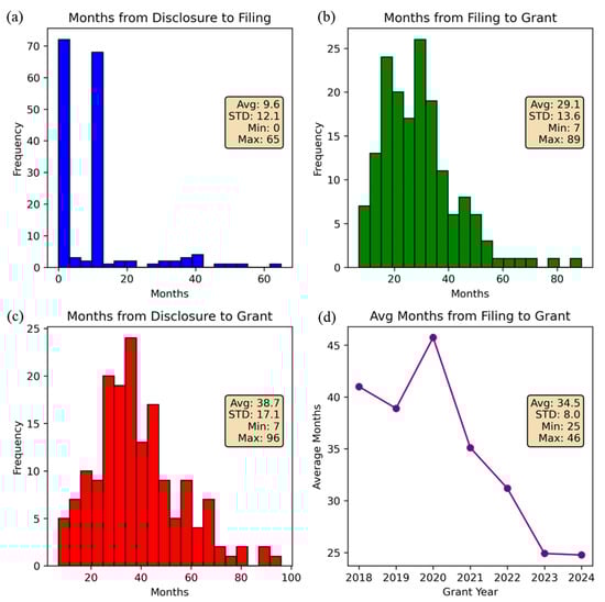 Latency measures: (a) from disclosure to filing, (b) from filing to award, (c) disclosure to grant distribution, and (d) average latency from filing to grant by award year.