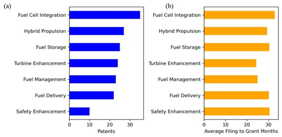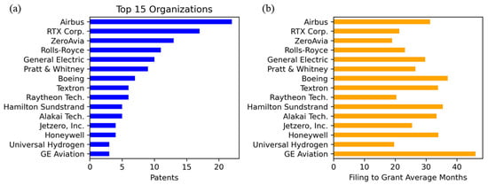 Figure 12 compares the top 15 patenting organizations in hydrogen aviation by awards and grant speed. Figure 12a ranks Airbus, RTX Corporation, and ZeroAvia as the top three awardees, highlighting strong engagement from both traditional aerospace firms and emerging players. Figure 12b shows the average time from filing to grant. RTX, ZeroAvia, and Universal Hydrogen experienced faster grants (under 25 months), while GE Aviation had the longest average delay (over 45 months). A low Pearson correlation coefficient of −0.31 suggests that the patent award level for each organization is not related to their average grant latency. These trends reflect both organizational maturity and patent prosecution efficiency.