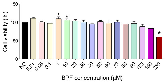 Effects of varying concentrations of BPF on SKOV3 cell viability. A slight increase in cell viability was observed at lower BPF concentrations (1 µM and 10 µM), while at higher concentrations a reduction in cell viability was evident. Data represent mean ± SD from at least 3 experiments. * p < 0.05 compared to NC.