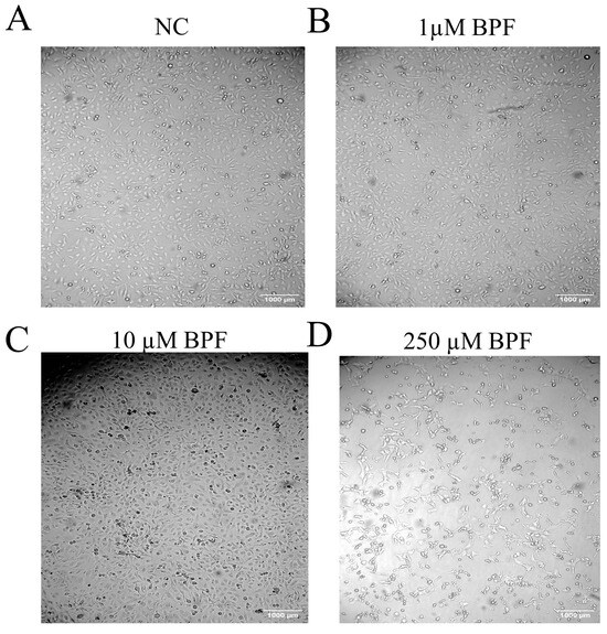 Microscopic images of SKOV3 cells treated with (A) DMSO (NC) and (B) 1 µM, (C) 10 µM and (D) 250 µM BPF concentrations. Low BPF concentrations (1 µM, 10 µM) had minimal effects on the cell morphology, while high concentration induced cell rounding compared to the control (Magnification 10×; Scale bar 1000 µm).