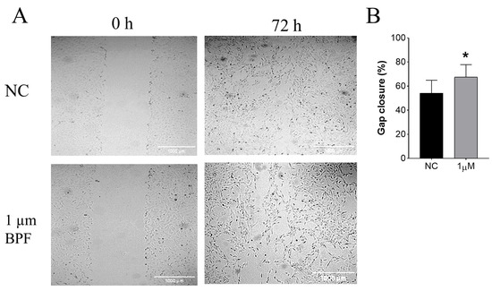 Metastasis is a complex process that involves cell migration and invasion, key characteristics of cancer [41]. To determine the effect of BPF on cell migration, a wound-healing assay was performed. Cells treated with 1 µM BPF exhibited a 13.5% increase in migratory ability (p = 0.0345) compared to untreated cells, as demonstrated by enhanced wound closure (Figure 3).