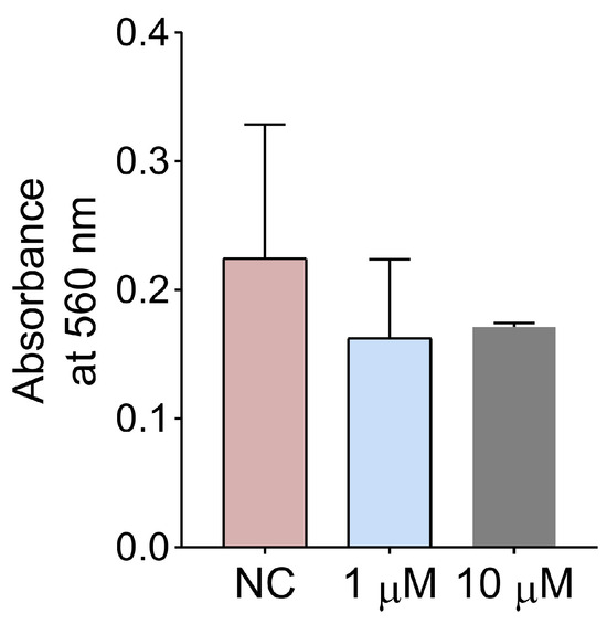 The invasiveness of OC cells following BPF treatment was evaluated to determine its effect on metastatic behavior. Moreover, 1 µM and 10 µM BPF treatment did not alter the invasive ability compared to the NC (p = 0.344) (Figure 4).