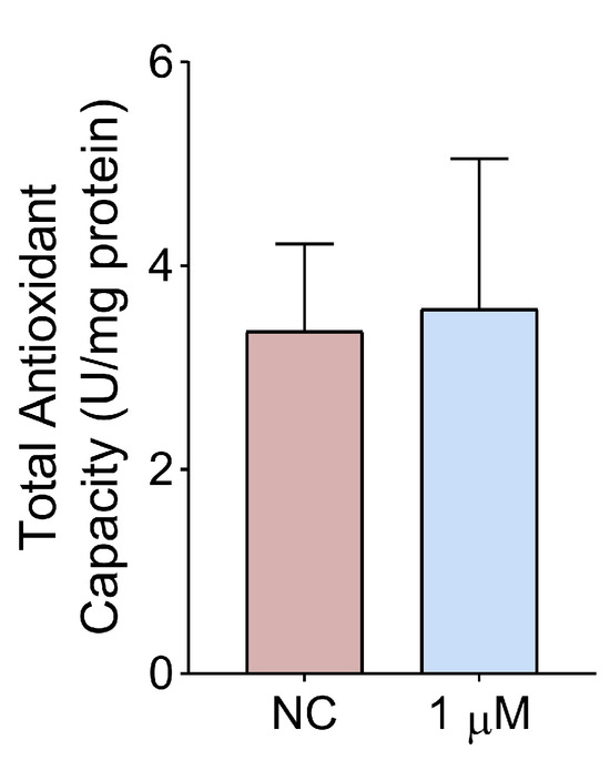 One of the key mechanisms in cytotoxicity is oxidative stress, and antioxidant capacity is important to protect the cells from oxidative damage. Previously, BPF has been implicated in generating reactive oxygen species (ROS) [42,43]. Therefore, to identify the impact of BPF treatment on oxidative balance, T-AOC was analyzed. The assay revealed no significant difference in T-AOC in 1 µM BPF-treated cells compared to NC (p = 0.8087) (Figure 5).