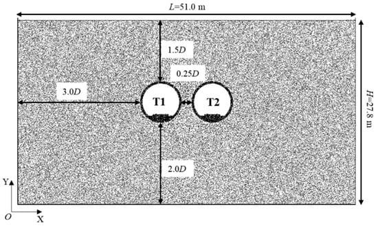 - Generate walls and particles. Specifically, particles with r1 = 0.06–0.1 m are placed far from the tunnel area, particles with r2 = 0.03–0.05 m are positioned closer to the tunnel area, and particles with r3 = 0.009–0.012 m are set near the tunnel area. The overall model is shown in Figure 3.