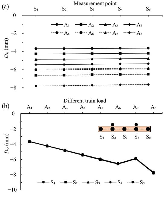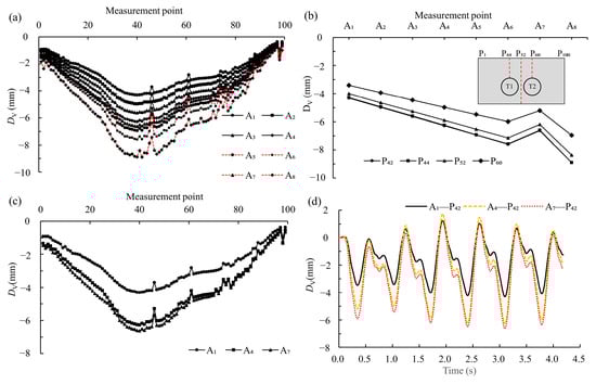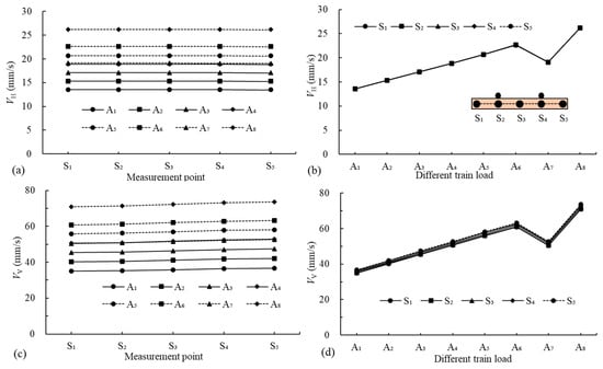 - Apply train loads. The train load is applied to the steel rails of Tunnel 1 under eight different conditions at a running speed of 120 km/h. The time required for a train to pass through the tunnel’s cross-section is calculated to be 4.18 s. The static and dynamic characteristics of the tunnel structure and its surroundings during train operation are monitored through the established observation points.