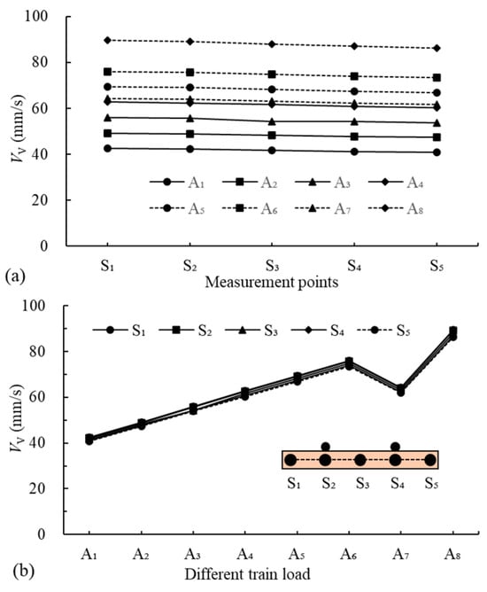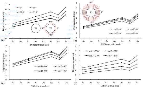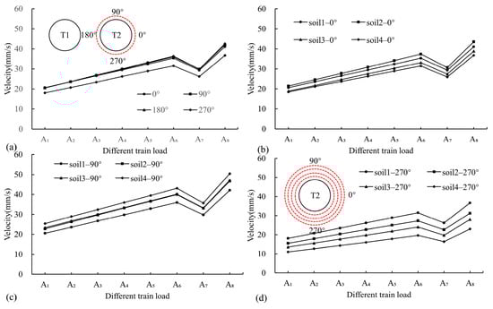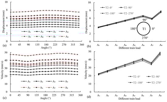 - The train vibration load in T1 significantly amplifies both the static and dynamic responses of T2 and its surroundings. However, a sudden decrease is observed under the A7 condition. This reduction can be attributed to the dynamic amplification effect dominating the pressure effect under A1 to A6 conditions, leading to a progressive increase in the dynamic response of T2. Under the A7 condition, the pressure effect surpasses dynamic amplification, leading to a sharp decline in T2’s dynamic characteristics. When the load reaches the A8 condition, the dynamic amplification effect far exceeds the pressure effect, resulting in a dramatic increase in T2’s dynamic response.