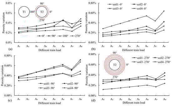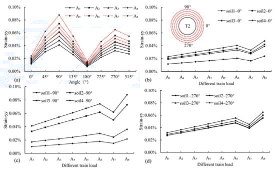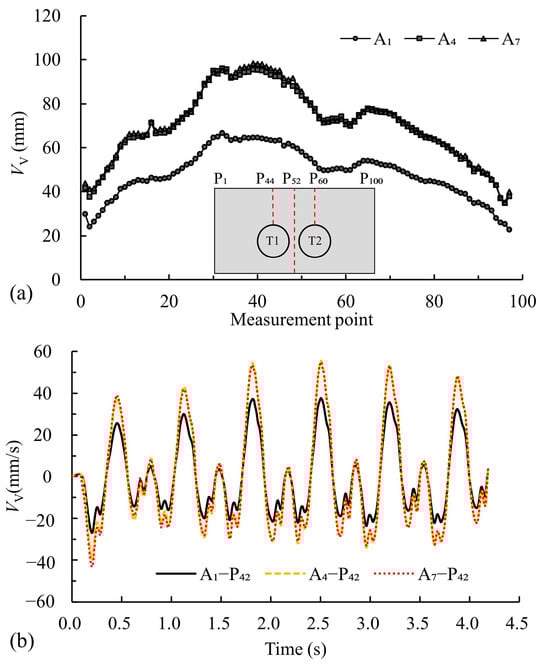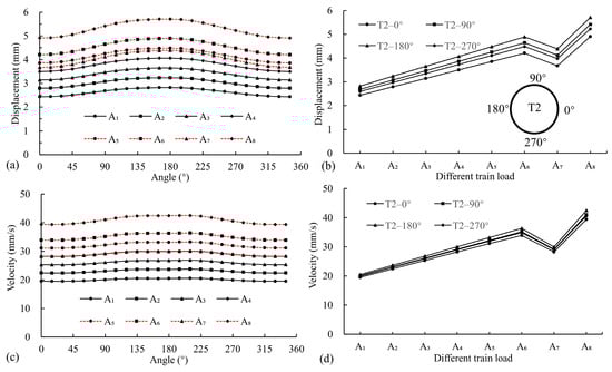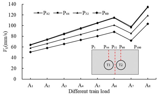 - The maximum DV and VV points on the surface are located slightly to the left above T1, surpassing those of the tunnel sleepers under the same conditions. The dynamic response of the surroundings under train loads is significantly influenced by the burial depth and tunnel structure, causing uneven compressive forces in the lower-right and upper-left regions of the T2 surroundings. Consequently, it causes elliptical deformation and potential liner–rock separation. When the train vibration load exceeds 92.0 kN (A4), the RP above the tunnel becomes significantly pronounced, emphasizing the significant impact of overload on the tunnel’s surroundings, particularly near the surface.
