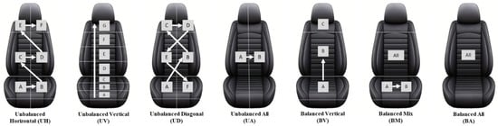A series of inflation and deflation patterns were assessed in a pilot study with three participants to evaluate their effectiveness in promoting dynamic posture adjustments, enhancing comfort, and redistributing pressure. While the sample size was limited, the inclusion of three participants is consistent with established engineering usability research, where studies have shown that 3–5 users are typically sufficient to identify the majority of usability issues and to refine system parameters effectively [19,20]. In this pilot study, a series of inflation and deflation patterns were evaluated to determine their effectiveness in promoting dynamic posture adjustments, alleviating fatigue, and redistributing pressure. These patterns varied in terms of targeted areas, inflation sequences, and directional flow, as illustrated in Figure 2. Based on participant feedback, the Balanced Mix (BM) pattern was selected as the most effective, offering the optimal balance of comfort and support.
