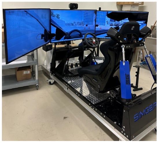 The study employed the SimGear driving simulator (Figure 3) to replicate a realistic and immersive driving environment. The simulator consists of a steering wheel and accelerator and brake pedals, complemented by three high-definition LCD monitors that provide a wide field of view, thereby delivering a lifelike driving experience. This setup allowed for the assessment of the effects of prolonged sitting and the AFMF system. The Carla driving simulation software was integrated with the SimGear system to create driving scenarios. Carla’s advanced capabilities include the creation of virtual road networks, the design of complex traffic scenarios, pre-simulation rehearsals, and the collection of vehicle trajectory data for subsequent analysis. Throughout the experiment, participants navigated a pre-determined standardized route displayed on the simulator’s screens. The software’s ability to produce consistent, repeatable conditions ensured uniformity across trials, thereby bolstering the reliability and validity of the study’s findings.