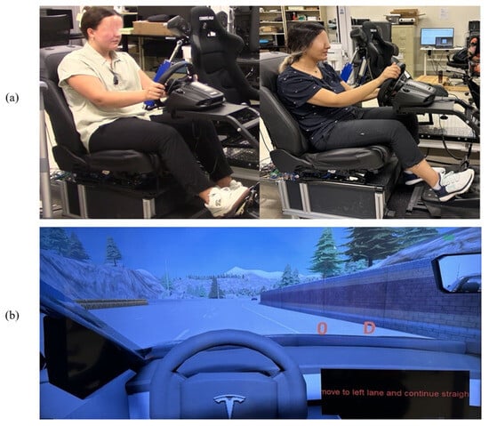 (a) Two Participants Seated in the Driver’s Seat of the Simulator; (b) the Driving Route is Displayed on the Simulator Screen along with Directions.