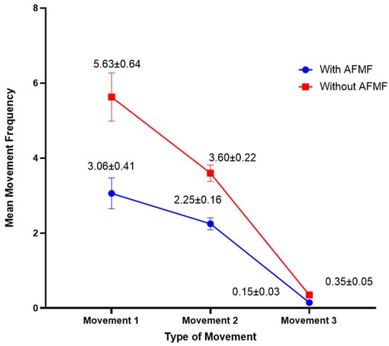 The interaction plot (Figure 6) illustrates that participants in the AFMF condition demonstrated lower mean movement frequencies across all movement types in comparison to those in the standard seat condition. This suggests that the AFMF system may effectively mitigate fatigue, thereby reducing the need for compensatory movements. The AFMF system appears to promote a more comfortable sitting posture over extended periods, potentially alleviating some of the fatigue that typically leads to frequent shifts and fidgeting.