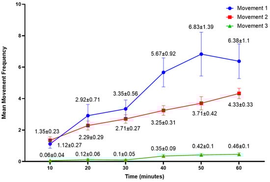 The interaction between Time and Movement Type (Figure 7) demonstrates a general increase in movement frequencies as the trials progressed. Type 1 movements showed the most pronounced rise, while Type 2 movements exhibited a more moderate increase. In contrast, Type 3 movements remained largely stable, with only minimal variation over time. Pairwise comparisons were conducted at each time interval to determine whether the differences in mean movement frequency between Movement Types were statistically significant. At all time intervals, the results indicated significant differences between Type 1 and Type 3 (p < 0.001) and between Type 2 and Type 3 (p < 0.001). However, no statistically significant differences were found between Type 1 and Type 2 (p > 0.05) at any of the time intervals.
