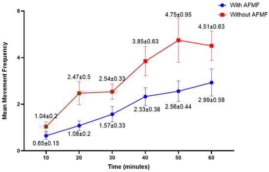 The interaction between Time and Driver Seat Condition (Figure 8) reveals a general increase in movement frequencies as time progressed. The seat without the AFMF system showed the most notable rise in movement frequencies, while the AFMF-equipped seat exhibited a more gradual increase, with consistently lower movement frequencies throughout all time intervals. Pairwise comparisons were conducted at each time interval to determine whether the differences in mean movement frequency between the driver seat conditions were statistically significant. The results revealed significant differences at 30 min (p < 0.001), 40 min (p < 0.001), and 60 min (p < 0.001). However, no statistically significant differences were found at the time intervals 10, 20, and 50 min (p > 0.05).