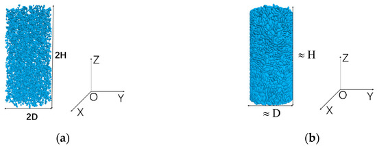 (1) Generate numerical simulation specimen. A cylindrical specimen (height: 1.2 m, diameter: 0.6 m) was generated by randomly distributing non-contacting clumps within the volume.