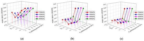 The effect of particle morphology on the initial void ratio of particle aggregate after consolidation has been discussed by many scholars. The previous studies mainly focused on the effect of particle EI, while the effect on FI is less discussed. Figure 3 shows the initial pore ratios of aggregates composed of different EI, FI and EI/FI particles under different lateral pressures. As can be seen from Figure 3a, the initial pore of the specimen decreases first and then increases with the increase in EI value under the same initial conditions and consolidation process. This is consistent with previous studies [29]. In Figure 3b,c, the effect of FI and EI/FI values on the initial void ratio of the particle aggregate is significantly different from that of EI. When considering FI, the initial void ratio of the particle aggregate is all small values.