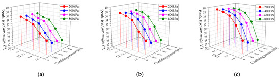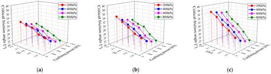 Figure 5 and Figure 6 show the relationship curves between EI, FI, EI/FI and peak friction angles under different lateral pressure. It can be seen from the figure that the different particle shapes have a significant influence on the peak and critical-state friction angles, and there are differences. When the EI, FI and EI/FI values are small, the peak friction angle first decreases slowly, and when the value is greater than 0.8, the peak friction angle decreases sharply, which is consistent with the trend observed in the literature [26,27,28,29,30,31]. However, the critical-state friction angle decreases uniformly as the shape parameter increases.