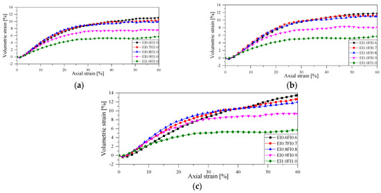Volumetric strain–axial strain curves of specimens with different particle shapes (200 kPa): (a) EI; (b) FI; and (c) EI/FI.