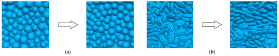 Figure 8 shows the relationship between the maximum shear dilatancy angle with lateral pressure and EI and FI. Figure 8 shows that the shear of the specimen is more affected by the shape of the particles than the lateral stress. As EI, FI, and EI/FI increase, the maximum dilatancy angle of the particle aggregate first increases and then decreases. The EI part has the same shear expansion law as Gong et al.’s [29] specimens. Figure 9 shows the change in particle arrangement during the shear process—see Figure 9a,b. The left side shows the arrangement of the specimens with different particle shapes before the start of shear after consolidation, and the right side shows the arrangement of the specimens at 60% axial strain. The particle shape in Figure 9a is EI = FI = 1, and the particle shape in Figure 9b is . A comparison of Figure 9a,b reveals that triaxial compression affects the particle arrangement, with a more noticeable impact on the non-ideal spherical particles. It is evident that when EI and FI are not equal to 1, shear causes the particles to shift from a random arrangement to a preferential horizontal orientation. Specifically, when , shear-induced displacement causes the initially random particle orientation to shift toward horizontal alignment, triggering volumetric dilatancy due to particle rearrangement. In contrast, when , the idealized spherical particle assembly tends to compact by filling interparticle voids under loading, leading to volumetric contraction. As illustrated in Figure 8 and Figure 9, higher values of EI and FI promote void-filling mechanisms, whereas lower values amplify shear-induced dilatancy dominated by particle reorientation and slippage.