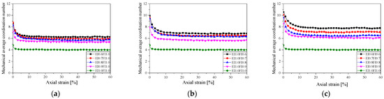 Figure 10 shows the coordination number–axial strain curve of thirteen different gravel-shaped particles at 200 kPa. As illustrated in Figure 10, the average coordination number exhibits a significant declining trend throughout the loading process. It decreases rapidly with increasing axial strain and eventually stabilizes at a constant value. With decreasing EI and FI, the coordination number of granule aggregate increased and enhanced the degree of granule interlocking, with a more stable contact force strand and a higher shear strength of granule aggregate, which is consistent with the results in Figure 4.