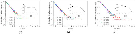 Figure 11 and Figure 12 show the relationship curves of the normalized normal contact force probability density function at 200 kPa. The internal illustration shows the correlation coefficients A and B with EI and FI, the correlation coefficient A shows a downward trend with the increase in EI and FI, and the correlation coefficient B shows an upward trend with the increase in EI and FI. Combining Figure 11 and Figure 12 shows that the probability density decreases as the normalized normal contact force increases. The normalized probability density distribution associated with different EIFI is more discrete at > 3, indicating that the normal contact force is less uniformly distributed at large strong contact forces. When 1 < < 3, the difference in probability density is not obvious, indicating a normal contact force where the strong contact force is less affected by EI and FI. When < 1, the particle aggregate’s weak contact probability density slightly decreased with the increase in EI and FI, the particles for the ideal sphere ( = 1), and the weak contact force probability density is significantly reduced, suggesting that the more particles in the ideal-sphere particle aggregate that are used to support the external load, the weaker the reduction in the weak contact force ratio of ideal-sphere specimen force-chain stability, which is also reflected in the fact that the ideal sphere finds it more difficult to carry out particle interlocking, indicating that the overall stability of the specimen is weak.