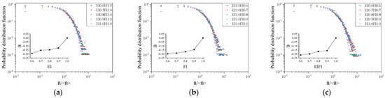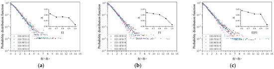 Figure 13 and Figure 14 show the relationship curves of the normalized tangential contact force probability density function at different scales and different EI/FI at 200 kPa. The internal insects show the correlation coefficients A and B with the relationship curve between EI and FI, and the overall law is similar to the normal contact force.