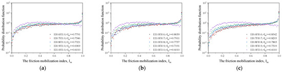 Figure 15 shows the friction-play exponential probability distribution function between different EI and FI at the pressure of 200 kPa. As shown in Figure 15, the probability density of the particles is high at < 0.7, and the distribution of is relatively more uniform, where is the average of the specimen friction play index. It can be seen that with the decrease in EI and FI, the of the particle aggregate gradually increases, which reflects that the more the particle shape of the constituent specimen deviates from the sphere, the higher the friction mobilization in the particle aggregate, and the more likely the particle interlocking, which is consistent with the macroscopic law mentioned above.