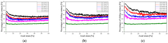 When > 0.9999, the contact between particles is defined as sliding contact. Figure 16 shows the sliding contact–axial strain curve of the specimens with different EI and FI at a lateral pressure of 200 kPa. The figure shows that sliding contacts increase rapidly with rising axial strain, peak at approximately 1% axial strain, and then gradually stabilize as shearing progresses. Furthermore, the proportion of sliding contacts increases as EI and FI decrease. The results of EI part of this study were consistent with those of Gong et al. [31] and Nie et al. [26].